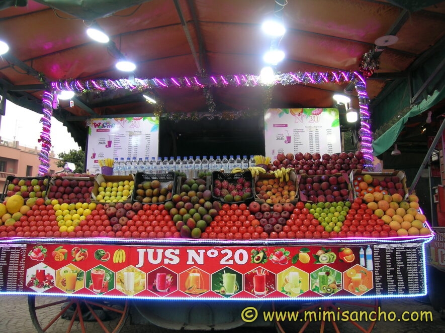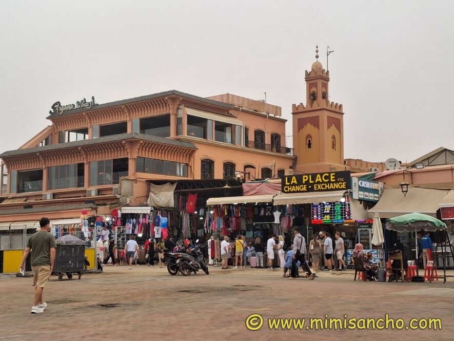 Nous voilà sur la Place Jemaâ El-Fna, c’est le cœur de la ville, l’endroit le plus animé de Marrakech, l’une des plus célèbres places du Maghreb. A l’origine cette place faisait office de place de Grève : c’est là que l’on décapitait les criminels et que l’on exposait publiquement sur un mur clouté, les têtes de rebelles ou des voleurs. De cette cruelle coutume popularisée par les Alaouites, la place tient son nom actuel qui signifie « l’assemblée des Morts», «la réunion des trépassés», ou encore «la place du Néant». Une appellation lugubre que plus rien ne justifie aujourd’hui.
