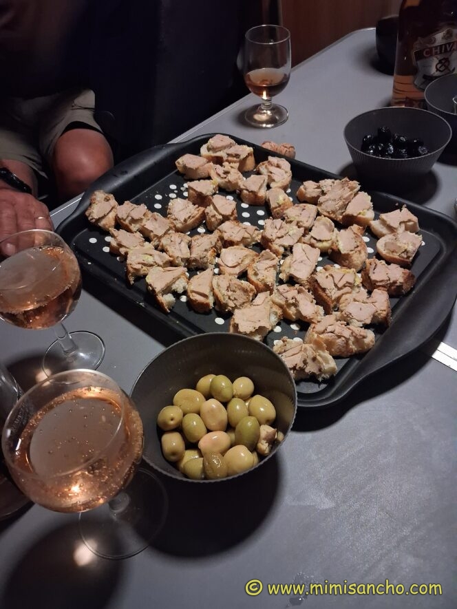 Champagne, toast foie gras (amené par Lydia et Christophe), côte à l’os, salade, et un magnifique gâteau aux 3 chocolats.