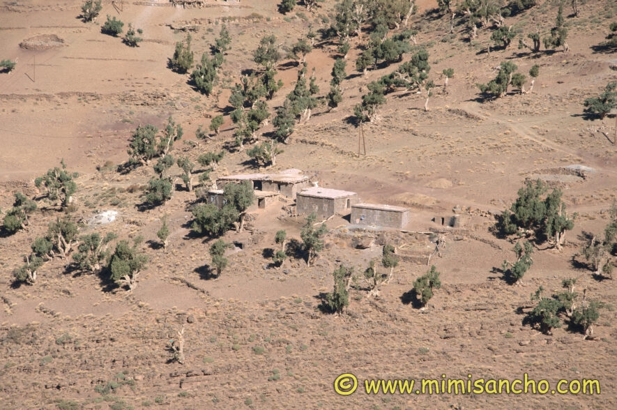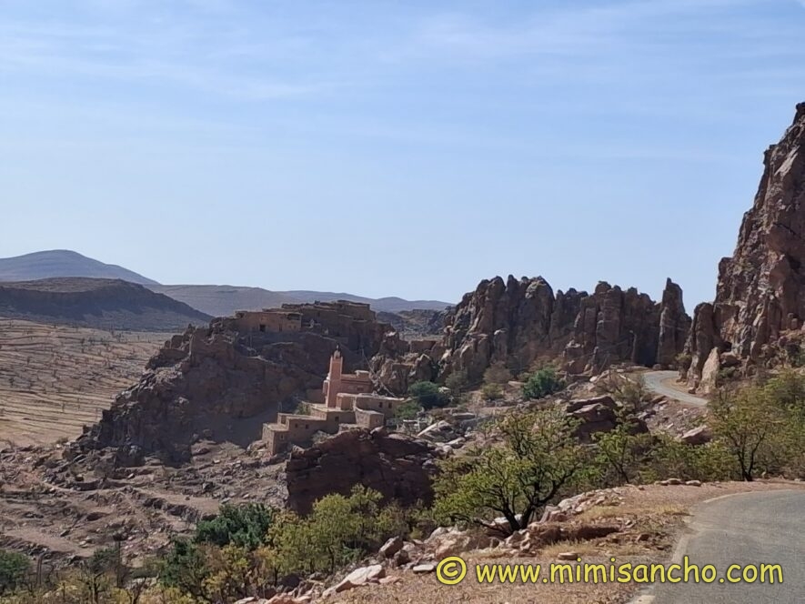 Nous sommes dans l’Anti-Atlas, des arganiers autour de nous, sur la route RR106, Aït Haissa, nous montons à 1385 m d’altitude – Oukaldi, des paysages rocailleux, puis 1413 m, au détour du virage, un village perché, accroché au rocher Tadiza.