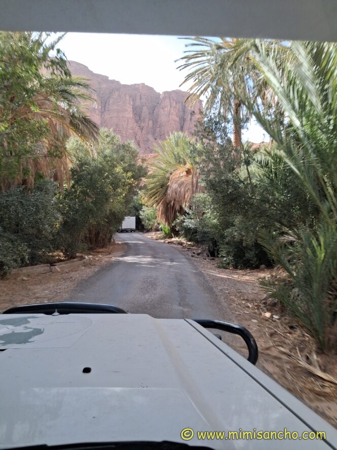 Aït Abdhalla sur la Haut Road, les paysages changent, des cailloux énormes, nous voilà à 1943 m d’altitude, puis ce sera une piste sur environ 7 kms, puis route goudronnée avec des lacets montants puis descendants, une vue magnifique. Au milieu d’un paysage sec et rocailleux apparaît tout à coup un palmier, puis deux, puis cent !