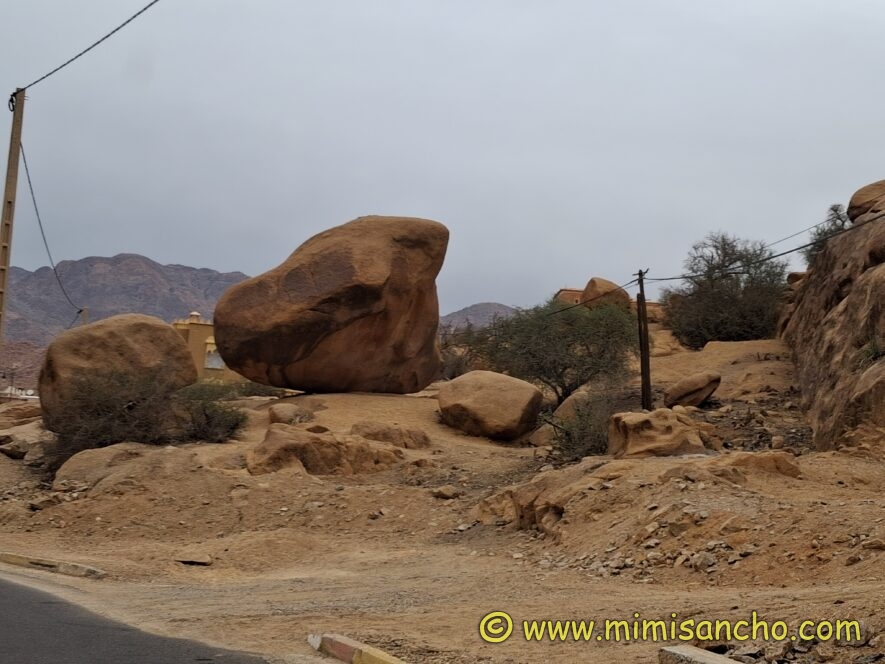 Nous arrivons à Tafraoute, dont le nom signifie «qui se cache entre les montagnes», un petit village aux maisons rouges et blanches. Construit au centre d’un cirque de montagnes de granit rose dont la beauté en fait un des lieux les plus magiques du Maroc. La lumière change les teintes de la montagne tout au long de la journée et atteint son apothéose au lever et coucher du soleil.