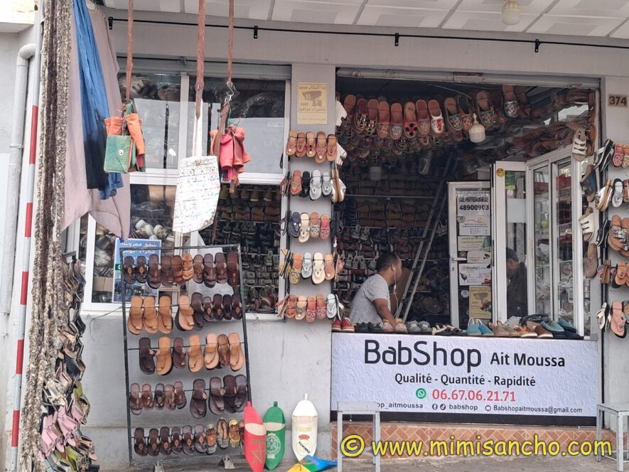 Visite du souk, Tafraout est non seulement spécialisée dans la confection des célèbres babouches mais aussi dans celle de l’»Amlou» : la pâte d’amandes mélangée à de l’huile d’Argan et à du miel que les marocains consomment sur du pain ou des crêpes au petit déjeuner. On y trouve également des magasins de vêtements et de graines diverses particulièrement les amandes, sans oublier les épices. Nous déambulons agréablement dans ce petit souk, faisons quelques achats, cadeaux et souvenirs.