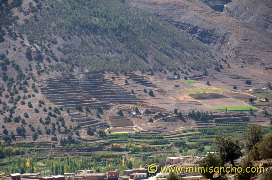 Une oasis suspendue à 1800 mètres d’altitude, dans la vallée heureuse, au creux de montagnes majestueuses, sous le regard du M’Goun, Aït Bougmez où ses berbéres recèlent des secrets longtemps gardés. Enclave du Haut-Atlas isolée, il y a peu encore, une piste goudronnée permet aujourd’hui de pénétrer dans la vallée s’étirant en un long ruban de 35 kms irriguée par les «séguias», ces canaux qui répandent l’eau de la rivière pour créer des terrasses en damier, véritable mosaïque aux couleurs éclatantes que nous pouvons voir. Nous traversons quelques villages d’agriculteurs berbères qui ponctuent le paysage, réunis autour des greniers fortifiés ou des tighremts (anciennes maisons fortes). Ces villages de terre ocre sont étagés sur les versants de la montagne dominant les champs de blé, d’orge et de maïs. Agriculture, élevage et artisanat rythment la vie des villageois. Dans cette vallée d’altitude, le temps s’écoule lentement.